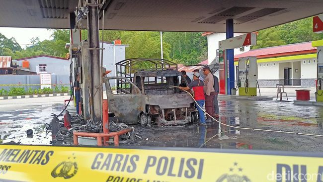 Toraja Utara - Kebakaran di SPBU Alang-alang, Toraja Utara, Sulsel mengakibatkan 1 pompa bensin dan mobil pikap hangus, Selasa (7/2/2023). 1 korban kritis akibat luka bakar.