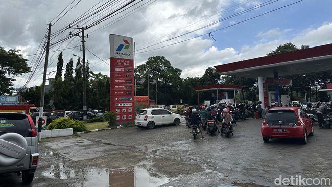 Foto: Antrean kendaraan di SPBU Palakka, Watampone menunggu isian BBM yang terbatas pada Rabu (22/3). Antrean disebabkan karena suplai BBM terhambat di Camba, Poros Maros-Bone. (Agung Pramono/detikSulsel)