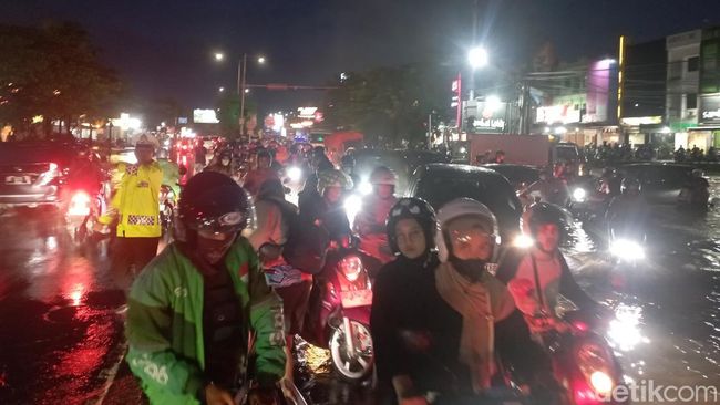Makassar - Kemacetan terjadi di Jalan Perintis Kemerdekaan, Kecamatan Tamalanrea, Makassar, Sulawesi Selatan (Sulsel). Situasi ini terjadi gegara banjir di ruas jalan itu.