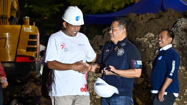 Makassar - Plt Direktur Utama PDAM Makassar Hamzah Ahmad meninjau pengerjaan koneksi jaringan pipa distribusi di Taman Segitiga Pa'baeng-baeng, Rabu (30/7/2025) malam.