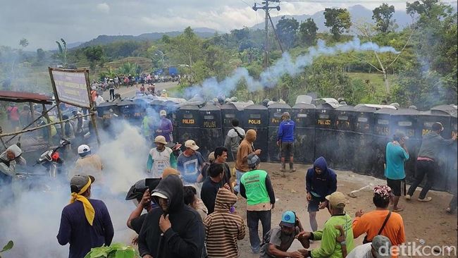 Hanya berselang sejam sejak demo dimulai, bentrokan pun terjadi. Massa yang mengadang petugas tersulut emosi ketika polisi kekeh masuk ke lokasi mengawal tim pengukur lahan.