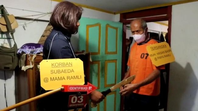 Rekonstruksi pembunuhan pensiunan guru tersebut berjalan sekitar satu jam. Semua adegan terlihat diperankan langsung tersangka Hasan Basri. Sementara korban diperankan oleh pemeran pengganti.