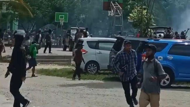 Sementara itu, suasana juga sempat memanas saat polisi mengamankan oknum pengibar bendera bintang kejora di kampus USTJ. Sekelompok massa mengadang polisi hingga akhirnya terjadi bentrok.