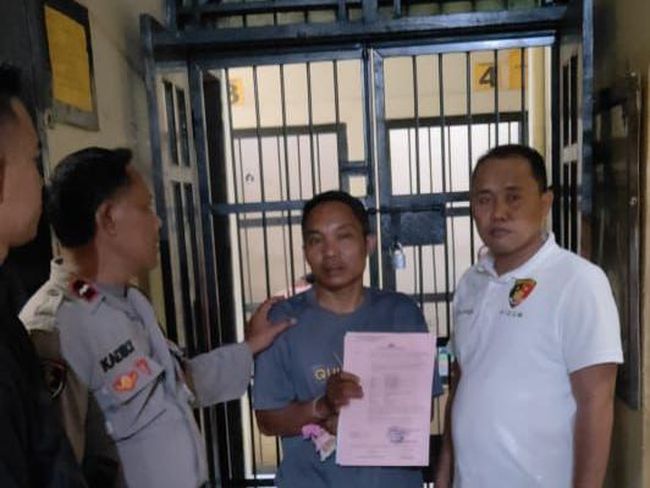Pelaku yang mengenakan celana pendek dan kaos abu-abu sedang memegang selembar kertas laporan polisi. Pelaku dikelilingi sejumlah aparat kepolisian.