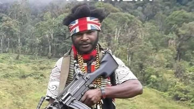 Pada foto tersebut, Egianus Kogoya juga memakai pengikat kepala dengan corak bendera Inggris. Dia terlihat membawa senjata api jenis Minimi yang merupakan senapan mesin ringan.