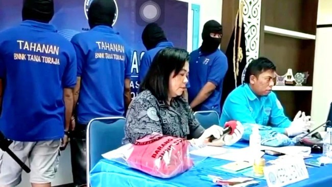 Konferensi pers yang digelar BNNK Tana Toraja tersebut berlangsung pada Rabu (15/2) lalu. Ada empat tersangka yang dihadirkan saat itu.