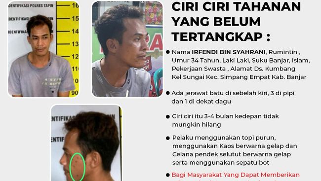 Polisi mengadakan sayembara untuk mencari Irfendi (34), tahanan kabur Polres Tapin, Kalimantan Selatan (Kalsel) yang lolos dari kepungan polisi saat bersembunyi ke dalam hutan. Warga yang memberikan info valid keberadaan buronan itu akan diberikan hadiah.