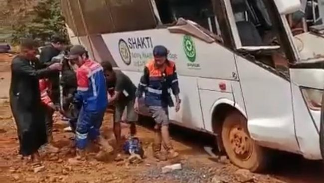 Bus yang membawa 19 karyawan perusahaan tambang di Konawe Utara, Sulawesi Tenggara (Sultra) terguling. 19 Karyawan yang baru saja melaksanakan ibadah salat Jumat.