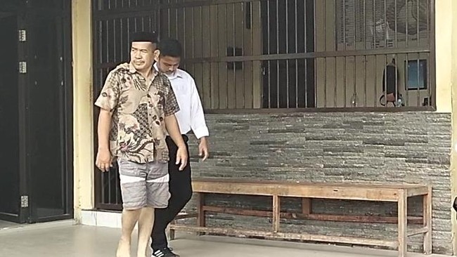 AR terlihat memakai baju batik lengan pendek berwarna coklat saat menjalani pemeriksaan di Polres Polman pada Senin (25/9). Dia mengenakan celana pendek abu-abu.