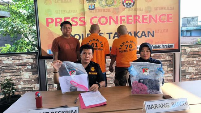 Dari foto yang diterima detikcom, kedua pelaku ditampilkan saat Polres Tarakan menggelar press release pada Jumat (27/10). Terlihat kedua pelaku tertunduk menghadap kebelakang.