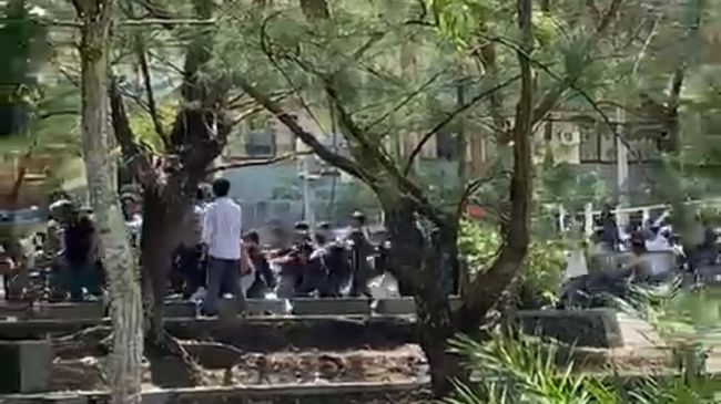 Dalam video beredar, tampak kerumunan mahasiswa di halaman kampus. Mereka kemudian terlibat saling kejar.