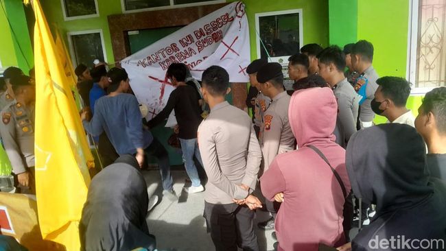 Pantauan detikcom di Kantor Kemenag Sulbar, Jalan Abdul Malik Pattana Endeng, Kecamatan Simboro, Jumat (15/3/2024) pukul 16.00 Wita. Massa yang tergabung dalam Pergerakan Mahasiswa Islam Indonesia (PMII) menyampaikan orasinya secara bergantian.