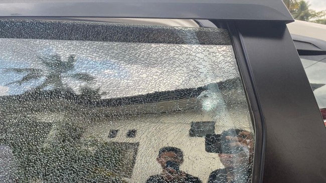 Sementara berdasarkan foto yang diterima detikcom, tampak kaca di sisi kiri mobil mengalami retak. Kemudian terdapat bekas benturan diduga benda keras berdiameter kecil.