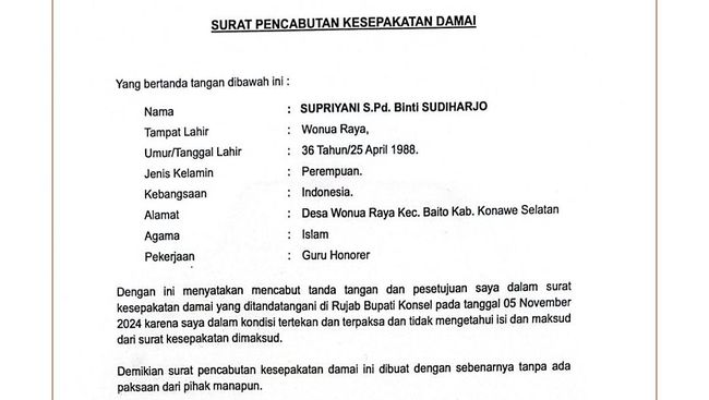 Keputusan itu ditetapkan Supriyani lewat suratnya terkait pencabutan kesepakatan damai yang diteken di Kendari, 6 November 2024. Surat tersebut ditembuskan kepada majelis hakim Pengadilan Negeri (PN) Andoolo, jaksa penuntut umum, Bupati Konsel, dan Kapolres Konsel.