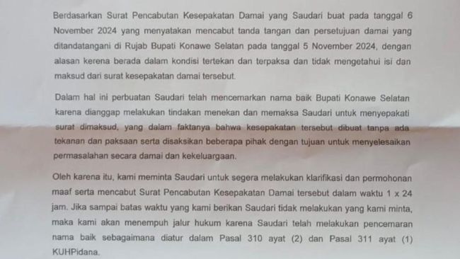 "Dalam hal ini, perbuatan saudari telah mencemarkan nama baik Bupati Konawe Selatan karena dianggap melakukan tindakan menekan dan memaksa saudari untuk menyepakati surat dimaksud, yang dalam faktanya bahwa kesepakatan tersebut dibuat tanpa ada tekanan dan paksaan serta disaksikan beberapa pihak dengan tujuan untuk menyelesaikan permasalahan secara damai dan kekeluargaan," bunyi somasi yang ditandatangani Kabag Hukum Pemkab Konawe Selatan Suhardin yang diterima detikcom, Kamis (7/11).