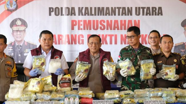 Polda Kalimantan Utara (Kaltara) mengamankan 74 kilogram sabu asal Malaysia dari tiga orang pria. Puluhan kilogram sabu tersebut sedianya akan dikirim ke Sulawesi Selatan (Sulsel).