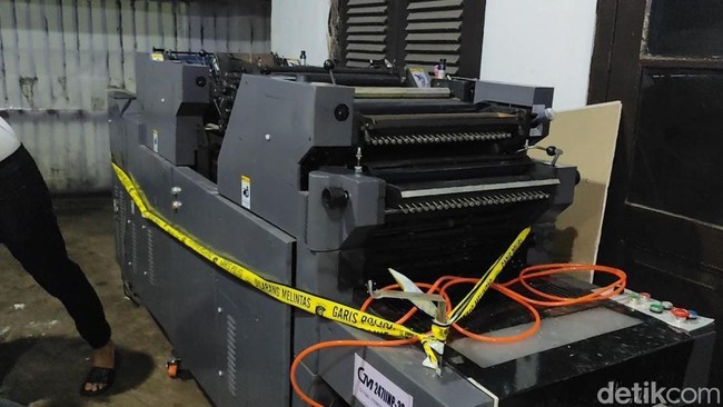 Dari foto yang dilihat detikcom, tampak mesin cetak berukuran raksasa disita polisi. Mesin itu terlihat berwarna abu-abu.