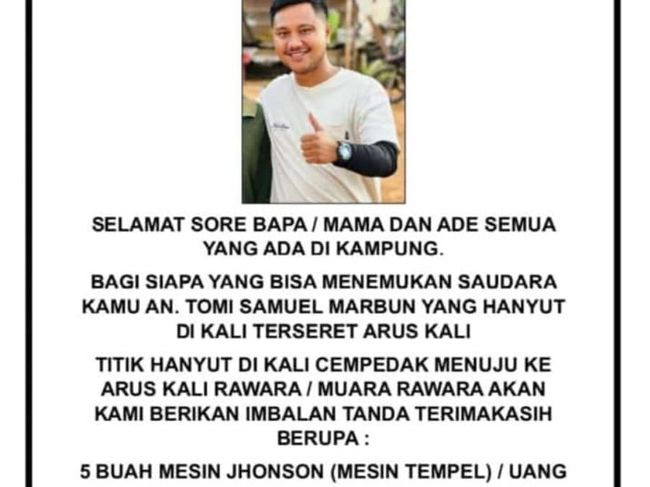 "Bagi siapa saja yang bisa menemukan saudara kami a.n Tomi Samuel Marbun yang hanyut di kali terseret arus kali, titik hanyut di Kali Cempedak menuju ke arus Kali Rawara/Muara rawara akan kami berikan imbalan tanda terima kasih berupa 5 buah mesin Jhonson (mesin tempel)/uang," demikian tertulis dalam edaran tersebut.