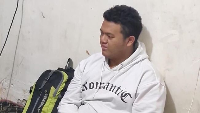 Pelaku tampak duduk bersandar di sebuah ruangan sambil menunduk. Kedua tangannya berada di depan dan tidak diborgol.