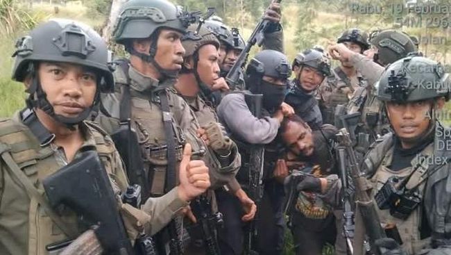 Dalam foto yang diterima detikcom, Aske Mabel ditangkap Satgas Operasi Damai Cartenz pada Rabu (19/2) pagi tadi. Aske Mabel diamankan sejumlah anggota Satgas Operasi Damai Cartenz yang membawa senjata api laras panjang dengan seragam pelindung lengkap.