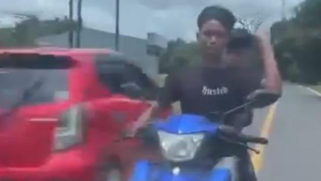 Pemotor berboncengan melempari batu dan menendang mobil pemudik di perbatasan Kabupaten Jeneponto-Takalar, Sulawesi Selatan (Sulsel). Aksi pelaku terekam kamera ponsel korban.