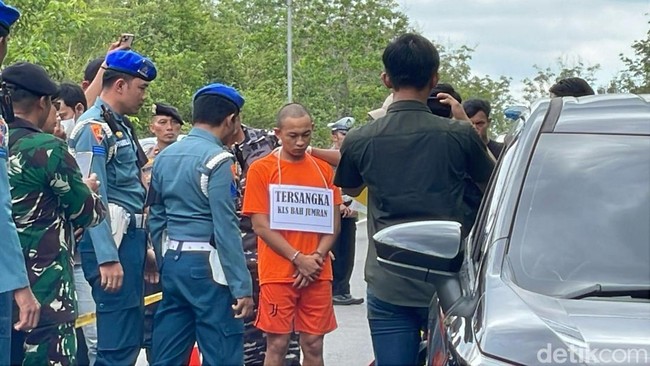 Terlihat pula rambut Jumran telah dicukur plontos saat mengikuti rekonstruksi. Masih dalam foto tersebut,