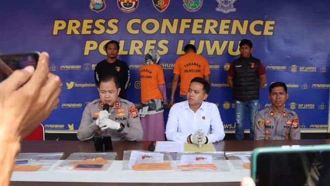 Polres Luwu menghadirkan HA dan MR dalam konferensi pers di Mapolres Luwu pada Rabu (16/4/2025). Keduanya tampak mengenakan baju tahanan berwarna oranye.