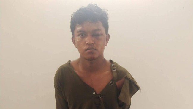 Wajah AL tampak lebam di bagian mata kanan akibat diamuk massa. Baju berwarna hijau tua yang digunakan AL terlihat robek pada bagian bahu dan leher.