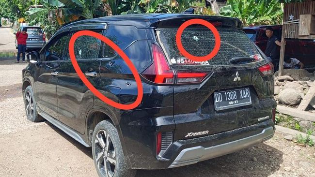 Dalam foto yang beredar, terlihat mobil Xpander dengan nomor polisi DD 1368 XAR terparkir di pinggir jalan. Terdapat lubang bekas tembakan di bodi dan kaca mobil.