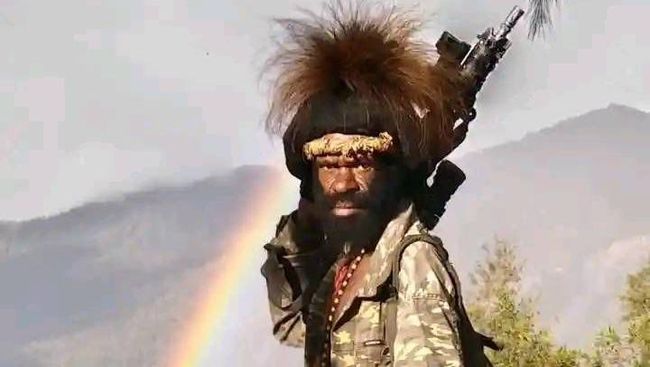 Undius Kogoya tampak mengenakan atribut khas Papua di kepalanya. Pentolan KKB itu menggunakan jaket bercorak loreng dan memakai sepatu boots.