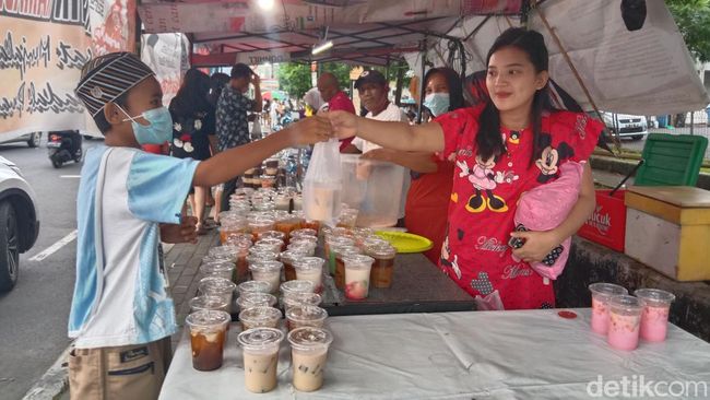 "Ada es buah-buah, bubur ayam, kacang hijau, bubur sumsum. Semuanya ada di sini. Ada juga seperti risoles, panada tore, tahu isi, bakwan, milu (jagung). Kukis yang basah, balapis, roti gulung, ada susu kurma, buah salak," kata Hasna.