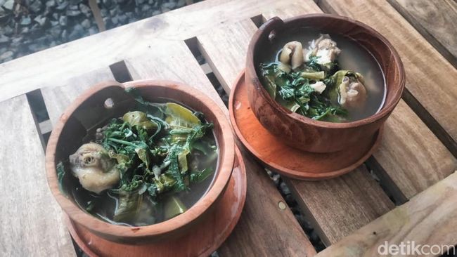 Ayam dan bumbu rempah tersebut kemudian diolah di atas tungku secara tradisional. Sementara penyajiaannya ditaruh di atas wadah mangkok berbahan kayu.