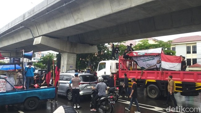 Pantauan detikSulsel di lokasi, Senin (12/2/2024) pukul 15.15 Wita, kendaraan mulai terhambat dari depan MAN 2 Makassar hingga kantor KPU Sulsel. Massa yang tergabung dari Aliansi Kesatuan Rakyat Indonesia Menggugat menutup satu lajur jalan tepat di Kantor KPU Sulsel dengan menggunakan mobil komando sambil berorasi.
