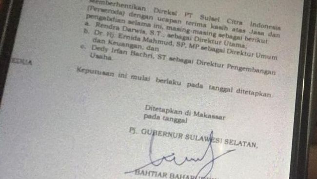 Sebuah surat berisi pemecatan 3 direksi Perseroda Sulawesi Selatan (Sulsel), PT Sulsel Citra Indonesia (SCI) beredar di media sosial. Ketiga direksi yang dipecat dalam surat itu adalah Direktur Utama Rendra Darwis, Direktur Umum dan Keuangan Ernida Mahmud, serta Direktur Pengembangan Usaha Dedy Irfan Bachri.