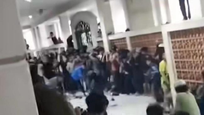 Sementara, dalam video beredar, tampak sekelompok bocah saling melempar sandal satu sama lain. Beberapa lemparan itu sempat mengenai plafon masjid.