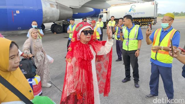 Salah satu jemaah bernama Andi Anna Baso (60), turun dari pesawat dengan penampilan mencolok. Dia memakai baju putih dan kerudung merah dengan kacamata hitam.