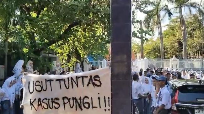 Aksi unjuk rasa yang melibatkan sejumlah siswa tersebut berlangsung di halaman SMAN 11 Makassar, Jalan Andi Mappaoddang, Kecamatan Tamalate, Senin (15/7). Massa turut membentangkan spanduk bertuliskan, 'Usut Tuntas Kasus Pungli'.