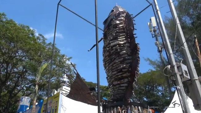 Kapolrestabes Makassar, Kombes Mokhamad Ngajib meresmikan tugu berbentuk ikan dari knalpot brong di Pos Polisi Fly Over Makassar, Sulawesi Selatan (Sulsel). Tugu tersebut sebagai bentuk komitmen polisi menjaga ketertiban dan kenyamanan kota.