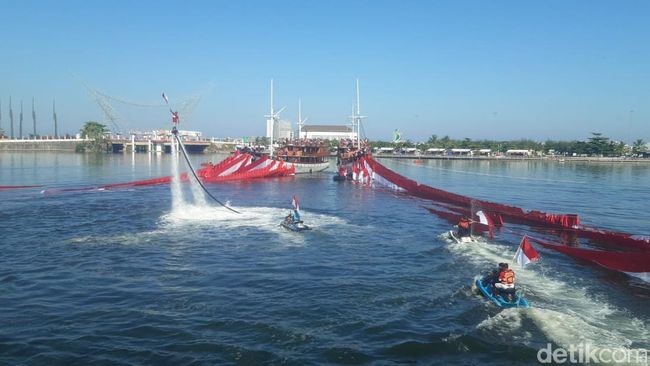 Di bawahnya berkeliling pengemudi jetski berboncengan yang juga membawa bendera. Terlihat dari atas kapal pinisi, para siswa SD dan SMP melambaikan bendera merah putih mengikuti nyanyian lagu kemerdekaan.