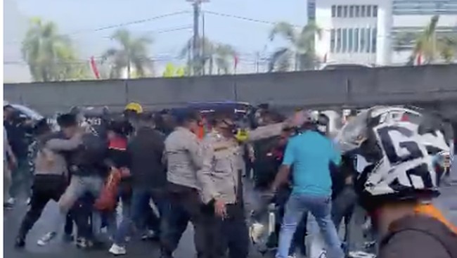 Kemudian dalam video lainnya tampak mahasiswa dan petugas kepolisian terlibat cekcok. Namun belum diketahui duduk perkara cekcok tersebut.