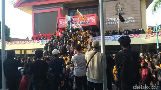 Massa mahasiswa demo tolak revisi Undang-Undang Pilkada di Kota Makassar, kini menduduki gedung DPRD Sulawesi Selatan (Sulsel). Massa masuk setelah aparat keamanan membukakan pintu gerbang.
