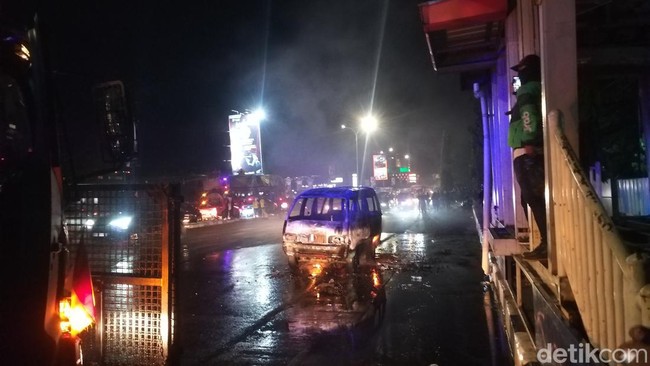 Sebuah mobil angkutan umum atau pete-pete terbakar di depan kampus Universitas Bosowa (Unibos) Makassar, Sulawesi Selatan (Sulsel) saat demo berlangsung ricuh. Polisi pun memadamkan api menggunakan water canon yang sempat membuat 5 penumpang kepanikan.