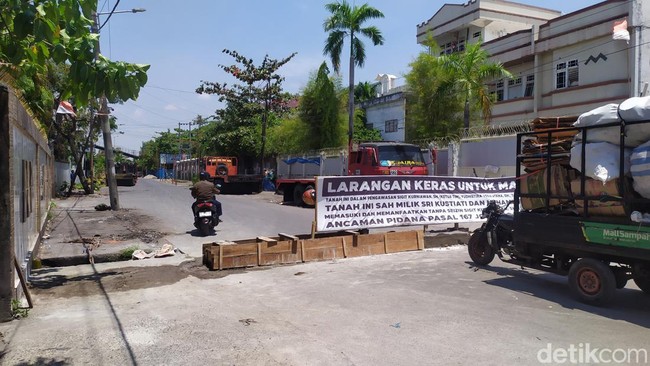 Tampak jalan tersebut ditutup dengan mengecor badan jalan. Terlihat juga spanduk yang terpasang di cor tersebut.