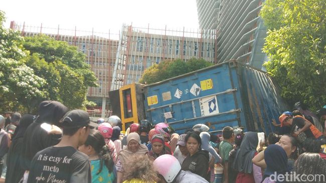 Truk kontainer yang mengangkut minyak goreng terbalik di halaman menara Phinisi Universitas Negeri Makassar (UNM), Sulawesi Selatan (Sulsel). Aparat kepolisian sudah berada di lokasi.