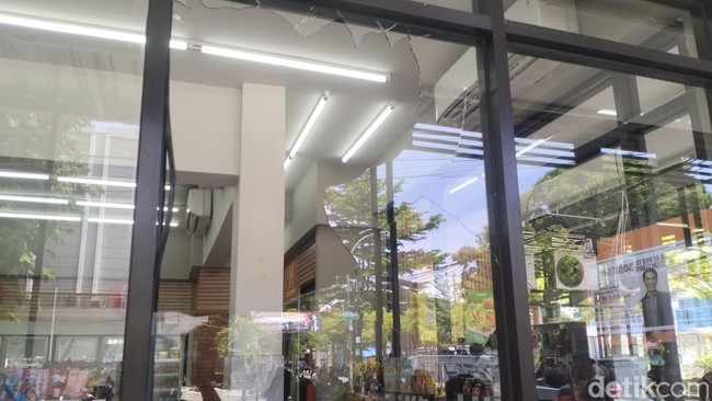 Lemparan mahasiswa juga mengenai minimarket di sekitar lokasi. Alhasil kaca minimarket tersebut pecah.