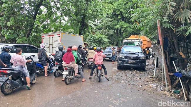 Warga secara sukarela mengatur lalu lintas dengan mengarahkan pengendara mengantre. Arus lalu lintas sudah mulai terurai.