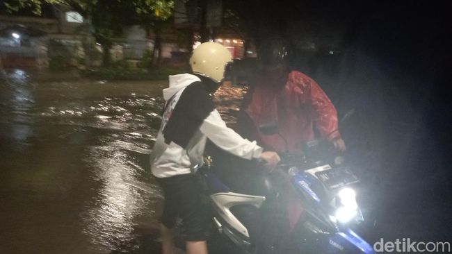 Tampak sejumlah pengendara motor nekat menerobos genangan air hingga mengalami mati mesin. Pengendara pun turun mendorong motornya.