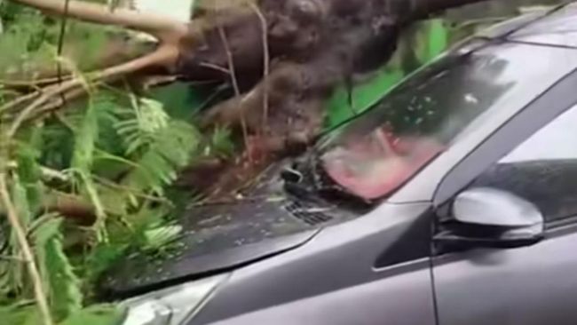 Sebuah pohon tumbang menimpa mobil yang terparkir di Perumahan Villa Mutiara Biru, Kota Makassar, Sulawesi Selatan (Sulsel). Insiden ini terjadi di tengah hujan deras disertai angin kencang di kawasan tersebut.