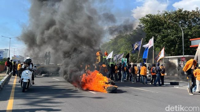 Pantauan detikSulsel, Kamis (1/5/2025) pukul 15.00 Wita, massa sudah berkumpul di depan kampus, Jalan AP Pettarani. Mereka membakar ban dan menggelar orasi.