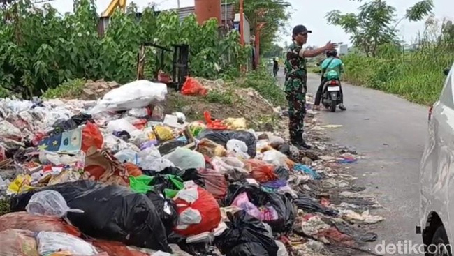 Tumpukan sampah itu meluber ke badan jalan. Situasi ini diperparah dengan adanya tanah timbunan milik warga yang akan digunakan membangun di lokasi.